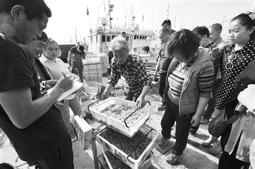 图为2016年4月24日,鱼贩在青岛沙子口中心渔港抢购鹰爪虾。