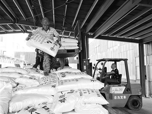 随着化肥秋销市场的启动,经销商及下游复合肥加工厂的拿货积极性明显提高。高峰时段,一天进出安徽六国化工股份有限公司自提化肥的大货车多达百余辆。六国公司抢抓秋销时机,组织好化肥生产、质检工作,做好来厂自提化肥开票、装运及车辆道路交通管理,确保各环节安全、顺畅、高效。图为8月29日下午,工人正在加紧装车。这车35吨磷酸一铵产品将被运往山东潍坊中天化肥厂。 陈 沐 摄