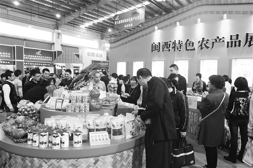 本报讯 11月8日,第七届海峡两岸机械产业博览会在福建龙岩举办。由福建龙岩市供销合作社主办、福建供销百农汇农产品有限公司承办的百农汇特色农产品展厅面积200多平方米,10多个展位展出了从100多家农民合作社中选取的300多种特色产品实物和1000多种特色产品图片。参展产品品类繁多,富有特色,展区顾客人头攒动,对农产品展纷纷点赞。