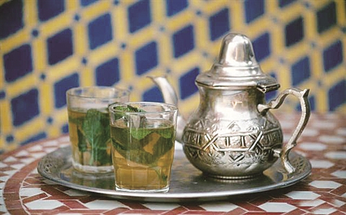 浅咖色的茶水从长嘴银壶里汩汩注入透明的玻璃杯,随着热气散开来的还有薄荷的清香,端起来尝一口,感觉非常甜。这种茶水在阿尔及利亚餐馆和当地人家,都能喝到。这种甜度非常高的薄荷茶,若不是当地人指出,笔者喝不出这竟是中国绿茶。饮用绿茶在阿尔及利亚,甚至整个北非地区都比较普遍。当地人喝绿茶的方式极具地方特色,不仅煮茶,加大量的糖,还要制造“慕斯”,就是通过反复斟茶,让茶汤上漂着一层泡沫,玻璃杯里茶水浅浅一层,大半杯都是“慕斯”,这就是阿尔及利亚人追求的极品。