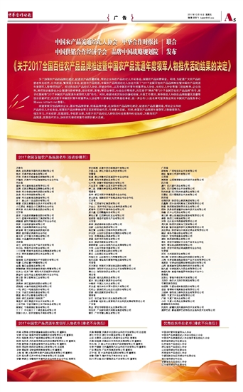 《关于2017全国百佳农产品品牌推送暨中国农产品流通年度领军人物推优活动结果的决定》