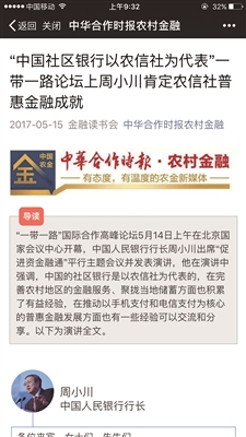 5月14日,中国人民银行行长周小川出席“一带一路”国际合作高峰论坛中的“促进资金融通”平行主题会议并发表演讲,他在演讲中强调,中国的社区银行是以农信社为代表的,在完善农村地区的金融服务、聚拢当地储蓄方面也积累了有益经验,在推动以手机支付和电信支付为核心的普惠金融发展方面也有一些经验可以交流和分享。