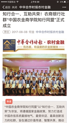 8月6日,中华合作时报社、中国农金商学院主办的“2017(首届)中国农金商学院董(理)事长联席会”召开。会上,发起成立了中国农金商学院知行同盟。该同盟以“知行合一、互助共荣”为宗旨,将遵循国家金融政策,努力打造成中国农信系统最接地气、最受欢迎、最具创新活力的社群,旨在通过价值传递、智慧共享,推动成员单位实现跨越式发展,共同打造数字化时代农商银行新的“第一方阵”。