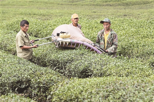 10月31日,浙江省诸暨市直埠镇圣友茶果场的工作人员正在用采茶机采摘茶叶,茶叶经过萎凋、揉捻、发酵、风干等工序制成红茶。该茶场2014年通过与杭州东方茶业应用技术研究所合作,逐步规范生产流程,所产红茶已经通过欧盟多项检测,主要销往欧洲市场。 通过双方合作,原先茶场只产春茶的模式变成了春夏秋三季茶,大大提高了经济效益,目前可年产茶1万千克,年产值40多万元。