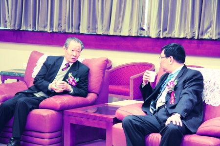 图二为中国石化协会名誉理事长谭竹洲(左一)与参会代表亲切交谈。