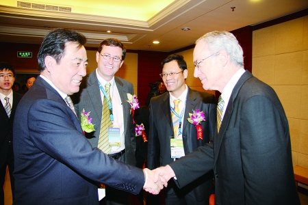 图三为中国石化协会会长李勇武(左一)会见外商代表。