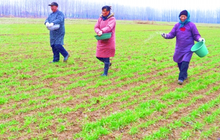 2月27日,江苏省东海县人口与计生委快速组织全县“少生快富”基地农民抢抓近3天普降喜雨的有利墒机,及时给基地小麦施撒返青肥,为夺取今年夏熟丰收奠定基础。