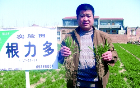 “今年我家麦子在这么恶劣的天气下长势仍然很好得益于从前年做示范开始,我就坚持用‘根力多’做底肥。从越冬期到现在我好几次都到地头查看小麦生长状况,没想到 我的麦子不但根系发达、分蘖也好,‘根力多’真是大显神威。” 说这话的是河北邢台南和农民范洪涛。