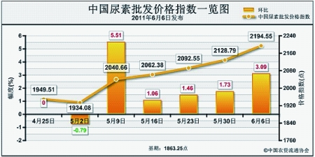 上周(5月30日-6月3日)国内尿素市场继续向好,价格较前一周上涨明显。6月6日国内尿素批发价格指数为2194.55点,环比上涨65.76点,涨幅为3.09%;比基期上涨331.3点,涨幅为17.78%。