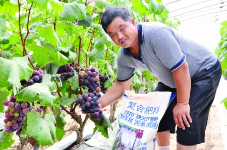 随后,周保国将他的种植秘诀告诉了记者。他说,他的葡萄园与往年相比,今年在两个方面做了改善。首先,葡萄膨果时,每棵树下铺上了反光膜,这样增加了葡萄的光照强度,使无法照射上太阳光的葡萄颗粒能从各个方向享受到了光照,缩短了葡萄的成熟期;其次,葡萄在选肥上做了改变,以往施用普通肥,今年他为葡萄全部施用了芭田惊天下(15-9-26)灌溉肥。结果,缩短了葡萄生长期,并使得其长势非常好。“选用芭田新型肥料是葡萄获得好收成的重要原因”,周保国这样告诉记者。