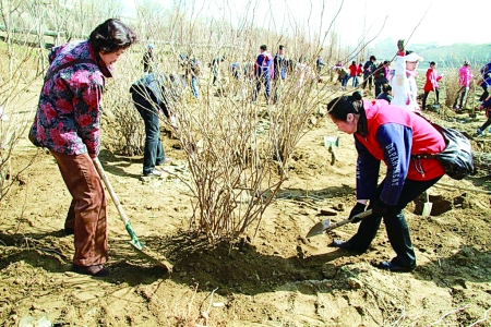 图为市民们正在林场栽植中药材山茱萸苗木。