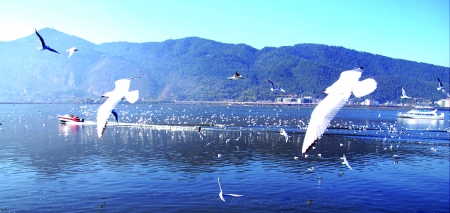 成千上万只来自西伯利亚贝加尔湖的海鸥飞临昆明过冬,为春城平添一道奇美壮观的风景线。