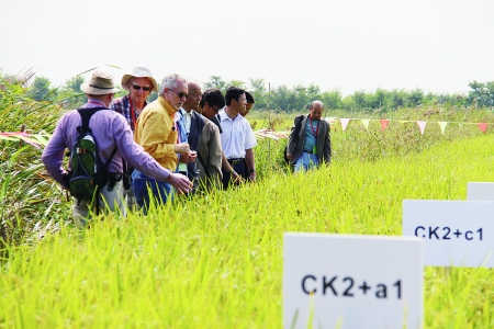 用现代物质条件装备农业,用现代科学技术改造农业,用现代产业体系提升农业,用现代经营形式发展农业,用现代新型农民推进农业,用现代发展理念引领农业……经济、精准施肥技术的有效实施,加速了黑龙江农垦规模农业的全面、整体、协调发展。图为外国专家现场观摩通过精准施肥后长势良好的水稻示范田。