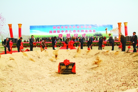 4月8日,山东聊城市现代农业示范园揭牌暨中农汇德丰种业项目奠基仪式隆重举行,中国工程院院士束怀瑞、国家发改委农经司巡视员胡恒洋、中共聊城市委副书记王忠林、中国农业生产资料集团公司总裁王全等专家领导出席活动,参加活动人数超过1000人,场面宏大。聊城市农业示范园项目揭牌标志着聊城开发区“一区七园”之一的现代农业示范园正式启动,中国农业生产资料集团公司(下称中农集团)与山东汇德丰种业合作项目的进驻,将对示范园区的建设起到极大的龙头带动作用。