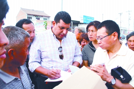 “这是一瓶补充镁的冲施肥产品,主要作用是能够在葡萄结果期帮助果实成长,更重要的作用是能够提高葡萄品质,一方面使得葡萄个头均匀、同时能防治和改善葡萄成熟期果实容易裂开的情况。”Mohamed Kamel博士现场给农户讲解。
