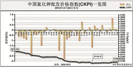 上周(2月17日-2月21日),受铁路运费上涨及春耕逐渐启动影响,盐湖钾肥上调价格,但氯化钾市场整体仍以稳定为主。2月24日,中国氯化钾批发价格指数(CKPI)为2156.60点,环比下跌0.61点,跌幅为0.03%;比基期下跌1133.99点,跌幅为34.46%。