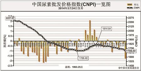 上周(3月17日-3月21日)国内尿素市场价格全面走跌。3月24日CNPI为1738.94点,环比下跌30.92点,跌幅为1.78%;同比下跌519.95点,跌幅为23.34%;比基期下跌155.23点,跌幅为8.33%。CNPI持续呈现震荡下跌态势运行。