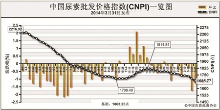 上周(3月24日-3月28日)国内尿素市场持续疲软,货源充足,价格继续走跌。3月31日CNPI为1685.77点,环比下跌22.25点,跌幅为1.30%;同比下跌531.15点,跌幅为23.96%;比基期下跌177.48点,跌幅为9.53%。CNPI持续呈现震荡下跌态势运行,下跌幅度加大。