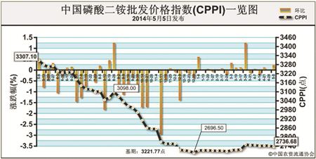上周(4月28日-4月30日),国内磷酸二铵价格低位走稳。5月5日,中国磷酸二铵批发价格指数(CPPI)为2736.68点,环比下跌5.59点,跌幅为0.20%;同比下跌570.42点,跌幅为17.25%;比基期下跌485.09点,跌幅为15.06%。
