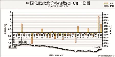 上周(8月11日-8月15日),国内化肥市场整体向好,尿素、二铵和氯化钾市场价格继续上涨。8月18日中国化肥批发价格综合指数(CFCI)为1938.32点,环比上涨24.36 点,涨幅为1.27%;比基期下跌440.55点,跌幅为18.52%。