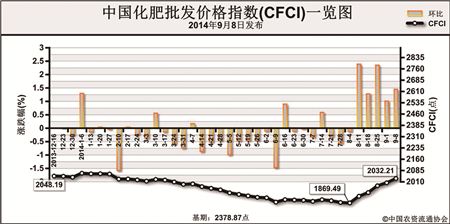 上周(9月1日-9月5日),中国化肥批发价格综合指数继续上扬。9月8日中国化肥批发价格综合指数(CFCI)为2032.21点,环比上涨28.80点,涨幅为1.44%;比基期下跌346.66点,跌幅为14.57%。