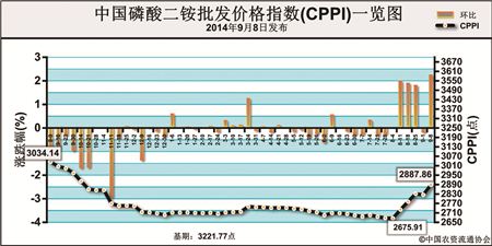 上周(9月1日-9月5日),磷酸二铵价格上涨。9月8日,中国磷酸二铵批发价格指数(CPPI)为2887.86点,环比上涨62.91点,涨幅为2.23%;同比下跌146.28点,跌幅为4.82%;比基期下跌333.91点,跌幅为10.36%。
