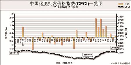 上周(10月6日-10月10日), 国内化肥市场整体企稳,二铵市场价格小幅上涨、氯化钾市场价格出现小幅下跌。10月13日中国化肥批发价格综合指数(CFCI)为2034.00点,环比上涨1.93点,跌幅为0.09%;比基期下跌344.87点,跌幅14.50%。