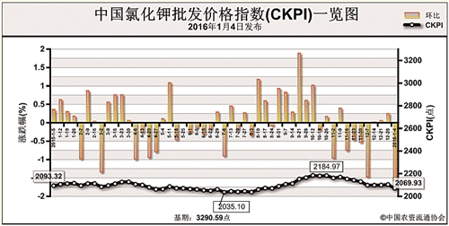 上周(2015年12月28日-12月31日),氯化钾市场整体平稳运行,临近元旦假期,市场交投气氛偏弱。1月4日,中国氯化钾批发价格指数(CKPI)为2069.93点,环比下跌34.03点,跌幅为1.62%;同比下跌23.39点,跌幅为1.12%;比基期下跌1220.67点,跌幅为37.10%。
