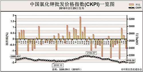 上周(2月22日-2月26日),钾肥市场成交暂无起色。2月29日,中国氯化钾批发价格指数(CKPI)为2010.30点,环比下跌16.87点,跌幅为0.83%;同比下跌73.53点,跌幅为3.53%;比基期下跌1280.29点,跌幅为38.91%。