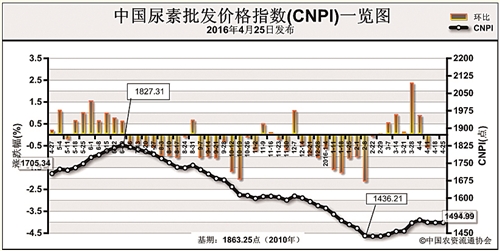 上周(4月18日-4月22日),国内尿素市场农业采购需求减弱、工业订单较好,尿素批发、零售价格指数维稳运行。4月25日,中国尿素批发价格指数(CNPI)为1494.99点,环比下跌0.04点,跌幅在0.00%;同比下跌210.35点,跌幅在12.33%;比基期下跌368.26点,跌幅为19.76%。中国尿素零售价格指数(CNRI)为1585.95点,环比上涨1.18点,涨幅为0.07%;同比下跌196.02点,跌幅在11.00%;比基期下跌319.01点,跌幅为16.75%。。