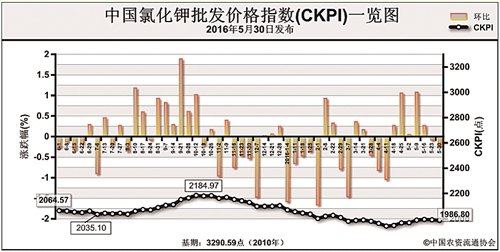 上周(5月23日-5月27日),氯化钾市场整体平稳,交投不旺,大合同谈判尚无结果,全球市场陷入观望状态。5月30日,中国氯化钾批发价格指数(CKPI)为1986.80点,环比下跌5.44点,跌幅为0.27%;同比下跌77.77点,跌幅为3.77%;比基期下跌1303.79点,跌幅为39.62%。