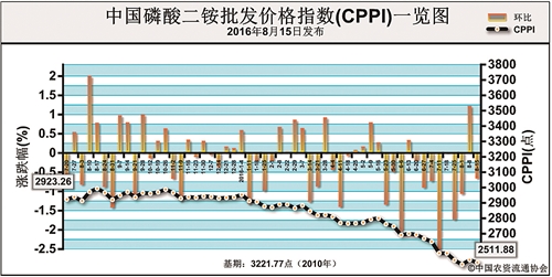 上周(8月8日-8月12日),国内二铵市场延续稳中偏弱态势,局部成交重心仍有下移。8月15日,中国磷酸二铵批发价格指数(CPRI)为2511.88点,环比下跌17.37点,跌幅为0.69%;同比下跌482.06点,跌幅为16.10%;比基期下跌709.89点,跌幅为22.03%。8月15日,中国磷酸二铵零售价格指数 (CPRI)为2766.89点,环比下跌2.40点,跌幅在0.09%;比基期下跌608.03点,跌幅为18.02%。