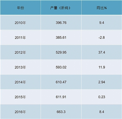 据中国无机盐工业协会钾盐钾肥行业分会统计,2016年全国资源型钾肥产量578.3万吨,同比上升1.1%,加工型硫酸钾产量147.8万吨,同比下降3.6%。而国家统计局的数据显示,2016年国产钾肥总量达到663.3万吨,同比增加了8.4%。根据数据不难看出,2012-2016年,国内钾肥产量保持增长态势。而钾肥产量的稳定增长,很大程度上得益于青海察尔汗和新疆罗布泊两大钾肥生产基地的技术创新和科学开采。在低品位矿和尾矿综合开发利用方面的突破,解决了盐湖卤水资源禀赋不均、尾矿资源浪费的问题,更重大的意义在于延长了我国钾矿有限资源的可开采年限,提升了国内钾肥的生产能力。