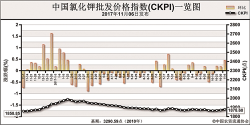 上周(10月30日-11月3日),国内氯化钾市场整体稳定,局部供求偏紧价格上涨。11月6日中国氯化钾批发价格指数(CKPI)为1878.68点,环比上涨8.24点,涨幅为0.44%;同比上涨19.84点,涨幅为1.07%;比基期下跌1411.91点,跌幅为42.91%。