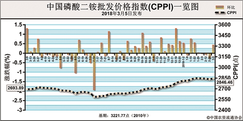 上周(2月26日-3月2日),因春节气氛仍较浓,基层市场需求尚未启动,企业新单跟进不佳,价格企稳运行。3月5日中国磷酸二铵批发价格指数(CPPI)为2846.46点,环比上涨11.85点,涨幅为0.42%;同比上涨140.31点,涨幅为5.18%;比基期下跌375.31点,跌幅为11.65%。