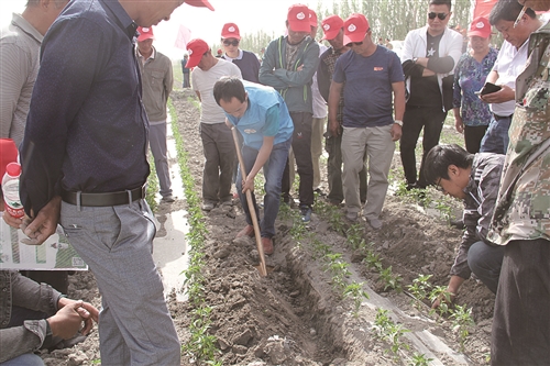 这是继今年3月底辣椒育苗大棚观摩会后,中国农资传媒记者对此方案的第二次走访。也是继去年农拓者辣椒“一站式解决方案”后的又一次种植模式的创新,即辣椒“一站式全程解决方案” 无底肥套餐的应用。据悉,此次 “一站式全程解决方案” 无底肥套餐,由农拓者和河北萌帮共同推出,利用两次施用高磷含腐植酸水溶肥替代常规底肥的方法,实现辣椒种植用肥全水溶,达到省时省工节肥节水的目的。全国农业技术推广服务中心肥料监测试验处(筹)处长田有国、中国农业科学院农业资源与农业区划研究所副研究员刘红芳、巴州农业技术推广中心植保站站长马诗科、新疆农拓者农业科技有限公司董事长刘彬、河北萌帮水溶肥料股份有限公司常务副总经理孟国明、新疆劲丰合农业科技有限公司总经理周应云等相关专家和企业负责人,以及农拓者的其他合作伙伴、农户、经销商等均从各地赶来参加此次观摩会。