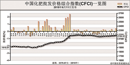 近期(6月4日-6月8日),中国化肥批发价格综合指数持稳运行。6月11日中国化肥批发价格综合指数(CFCI)为2184.61点,环比上涨8.53点,涨幅为0.39%;同比上涨265.7点,涨幅为13.85%;比基期下跌194.26点,跌幅为8.17%。6月11日中国复合肥零售价格指数(CCRI)为2444.17点,环比上涨3.87点,涨幅为0.16%;同比上涨183.20点,涨幅为8.10%;比基期下跌2.54点,跌幅为0.10%。