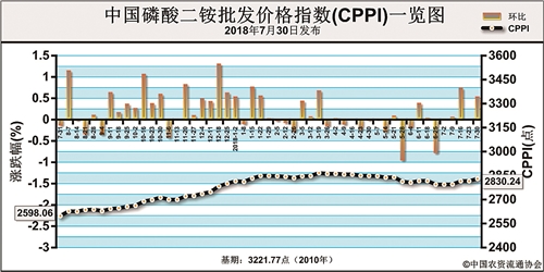 上周(7月23日-7月27日),受原料磷矿石价格上涨,出口市场持续向好,二铵价格稳中上行,企业报价灵活调整,货源供应偏紧。7月30日中国磷酸二铵批发价格指数(CPPI)为2830.24点,环比上涨14.71点,涨幅为0.52%;同比上涨227.93点,涨幅为8.76%;比基期下跌391.53点,跌幅为12.15%。